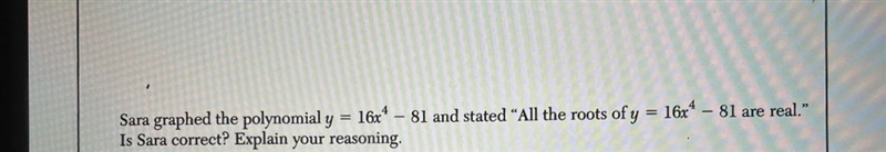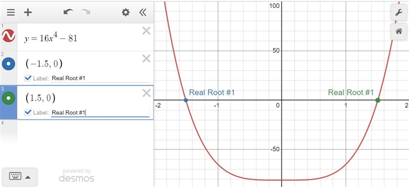 If you look at the graph of y = 16x^4 - 81, you see that it intersects the x-axis at two distinct places so there are two real solutions. Whenever a polynomial function intersects the x-axis, there are at least one or more real roots.