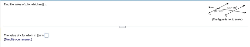 Looking at these angles, we can see that they are alternate interior angles. Alternate interior angles are congruent. This means that to solve we will simply need to set the given expressions equal to each other and solve for x.