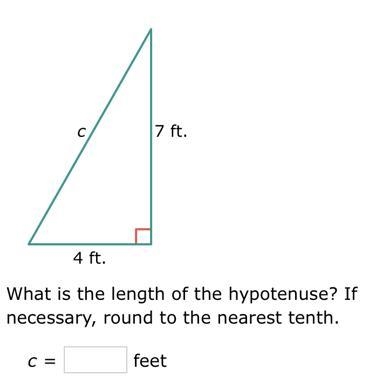 C C = 7 ft. 4 ft. What is the length of the hypotenuse? If necessary, round to the nearest tenth. feet