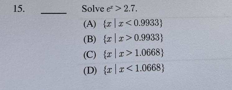 50 Points! Multiple choice algebra question. Solve e^x>2.7. Photo attached. Thank you!
