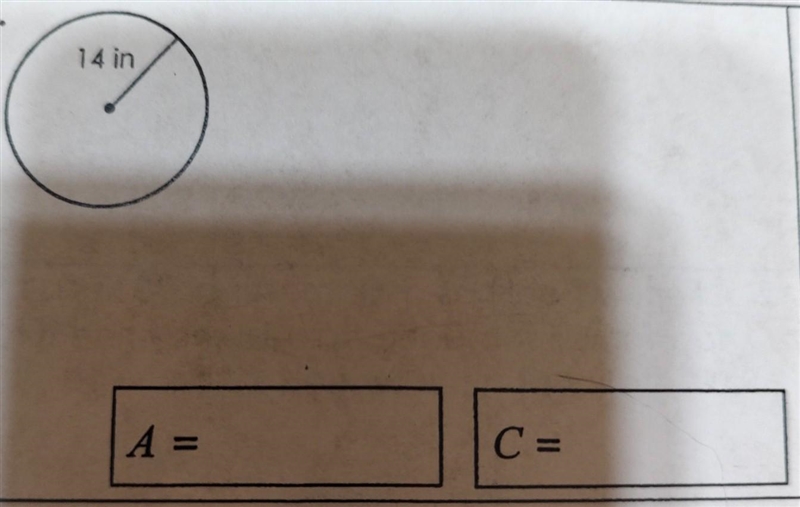 We can find the area and circumference of this circle by plugging the given radius length (14 in) into the area and circumference formulas.