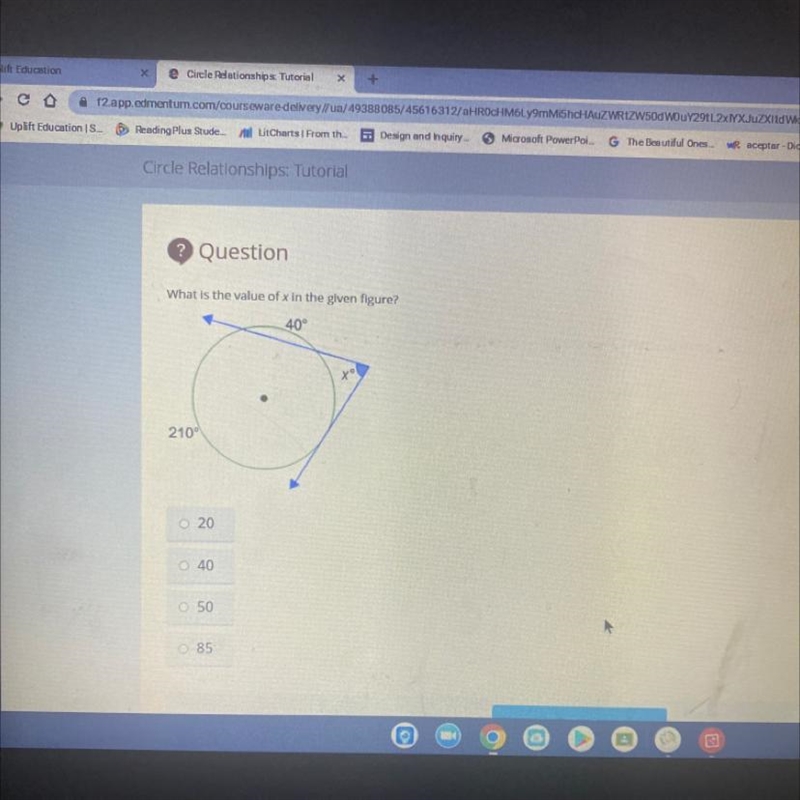 What is the value of x in the given figure? 40° 210 O 20 O 40 O 50 O 85