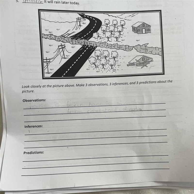 Inferences: The Telephone pole, The trees, and The house are falling over or has collapsed.