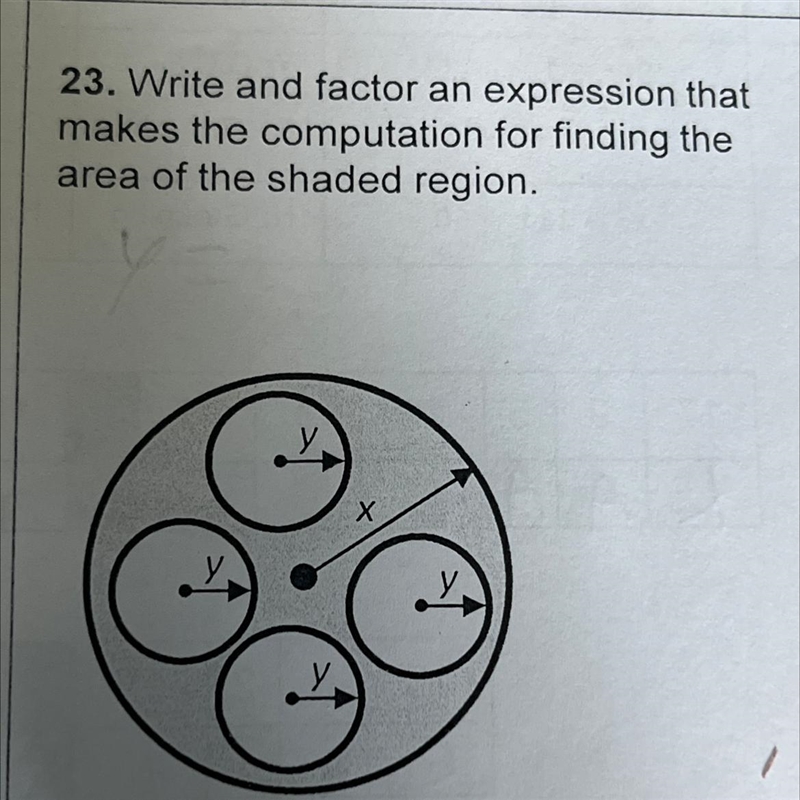 so hmmm the larger containing circle has a radius of "x", whilst there are four small circles in it with a radius of "y".