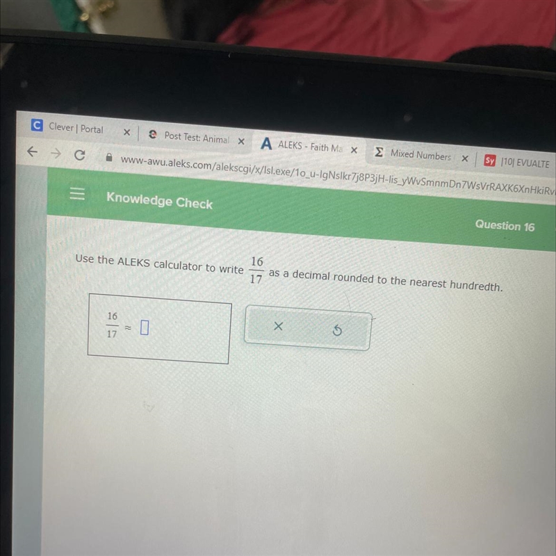 You can put 16/17 into the calculator and you will get 0.941176471, so you just round to the nearest hundredths, like it asks ,and there you go.