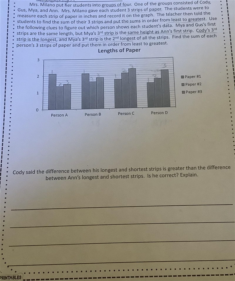 Gus and Mya have the same height of strip one. Therefore person one or two is Gus and Mya. Next Mya's third strip is equal to Anna's third strip. That shows Anna is person D and Mya is A and Gus is B and Cody is C. We are now comparing Cody and Anna's Data. Cody's longest strip is three and shortest is one. Both is much bigger than Anna's data. Cody is correct.