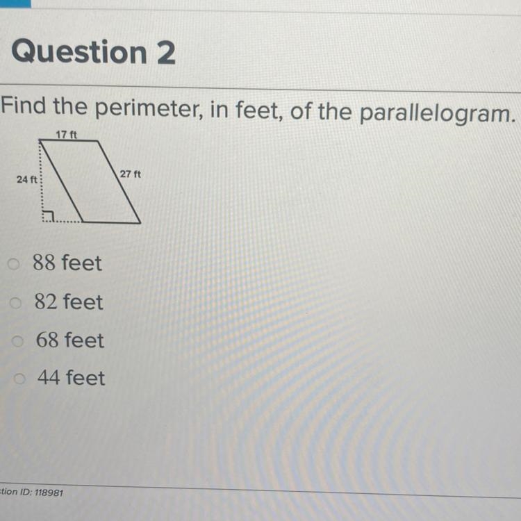 Perimeter is finding the sum of all the sides of the figure and in this case in the parallelogram. So on a parallelogram 2 sides are parallel while the other 2 sides are parallel to each other so there are 2 sides that are 17ft and another 2 are 27ft so adding them all together 17+17+27+27= 88ft for the perimeter