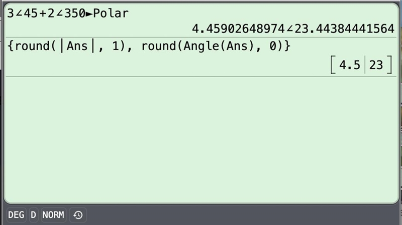 3∠45° = (3cos(45°), 3sin(45°)) ≈ {2.1213, 2.1213}