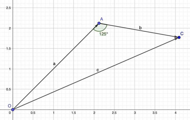 c = √(a² +b² -2ab·cos(C)) ≈ √(3² +2² -2·3·2·cos(125°)) ≈ √19.883 ≈ 4.545