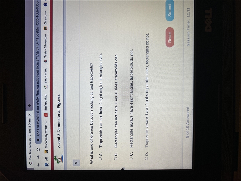 The answer is B. Rectangles always have 4 right angles, trapezoids do not.