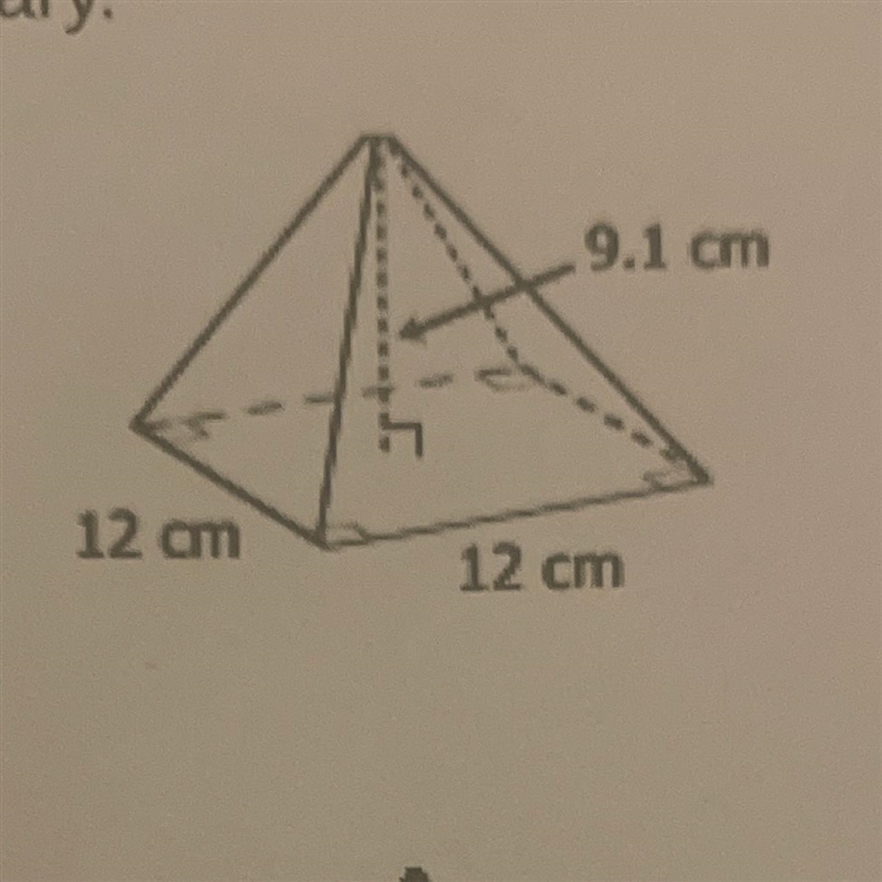 Find the area of the right pyramid with side of square base 12 cm and height of 9.1 cm: