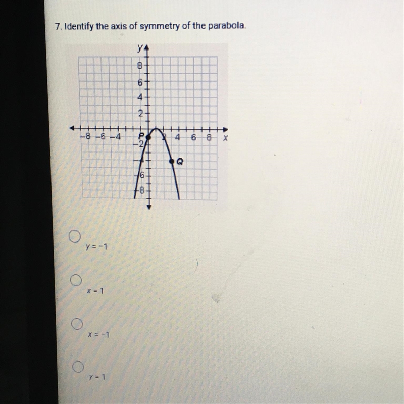7. Identify the axis of symmetry of the parabola. y = -1 -8-6-4 P -2/ X = 1 X = -1 y4 8 y = 1 6- 4- 2+ CO + 4 68 X Q