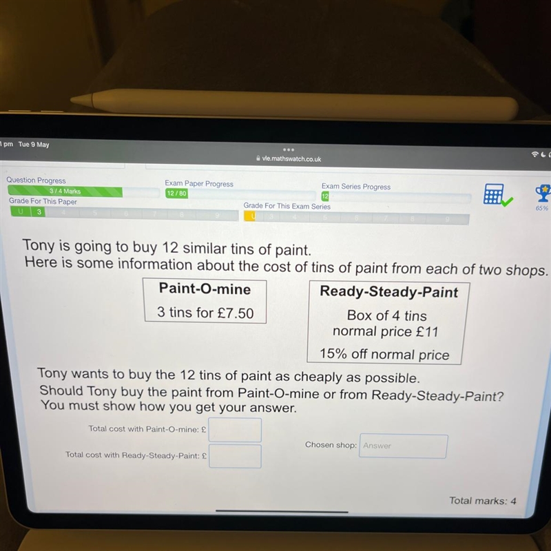 if he needs 12 tins, and purchased from paint -O mine, he would spend (12/3) X 7.50 = 4 x 7.50 = £30