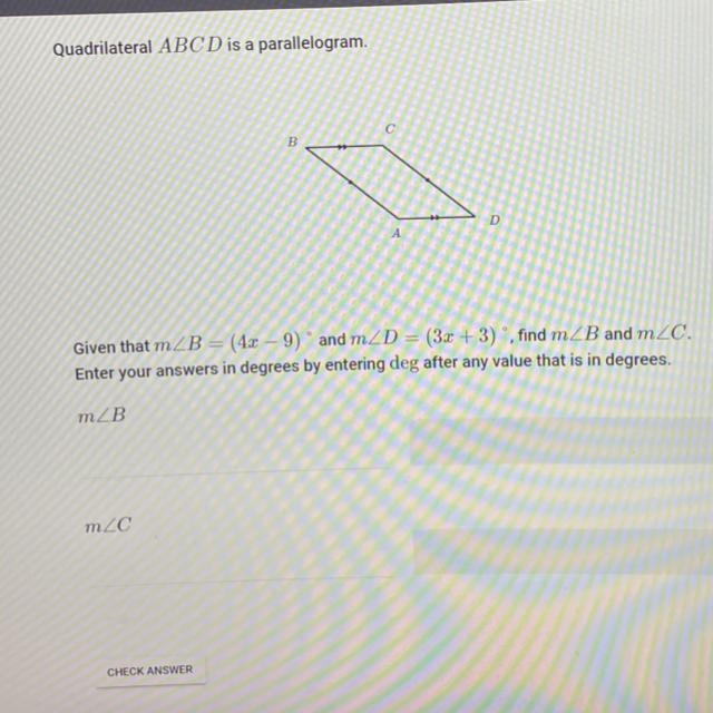 Given that m/B= (4x-9) and m/D= (3x+3), find mZB and mZC.
