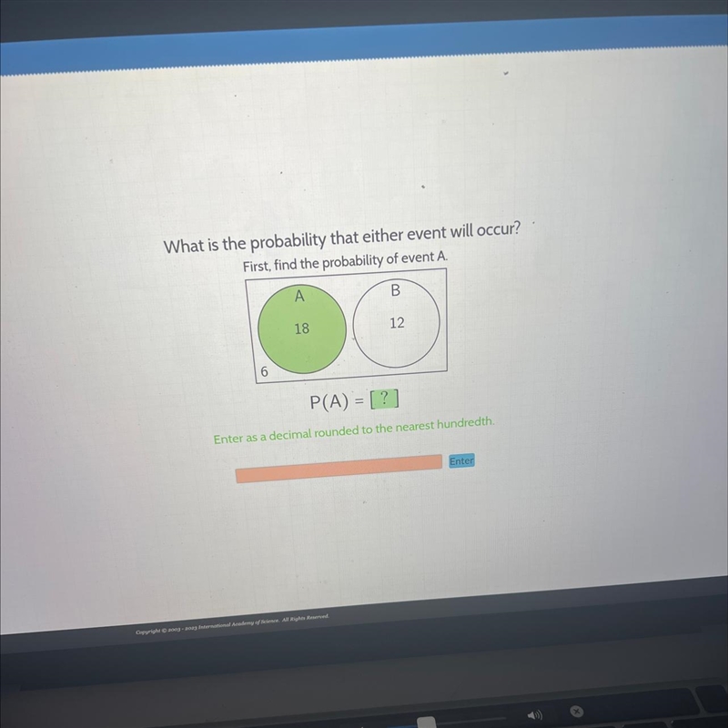 You want the probability of events A and B, and the probability of either event, given their frequencies are 18 and 12 out of 36 trials.