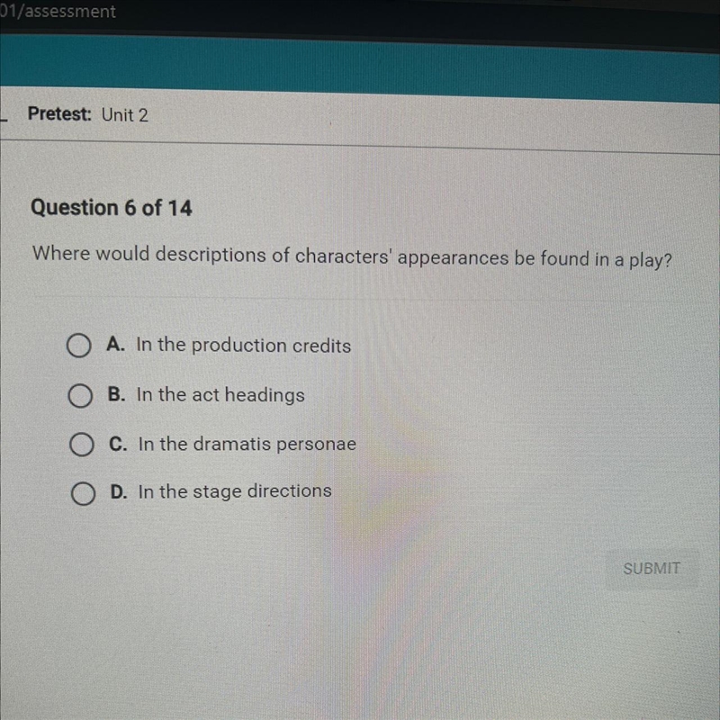 Stage directions are typically known for describing the setting but will describe the characters and what they're doing as well.