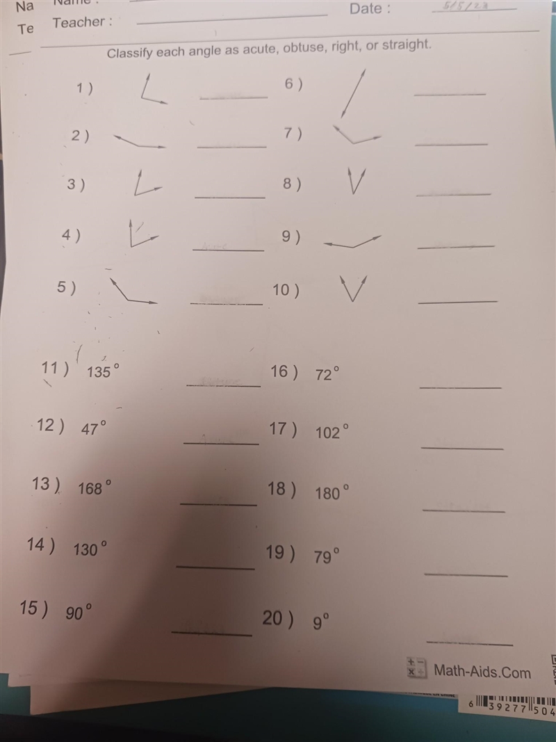 Answer: 1. right 2. obtuse 3. acute 4. acute 5. obtuse 6. straight 7. obtuse 8. acute 9. obtuse 10. acute 11. obtuse 12. acute 13. acute 14. obtuse 15. right 16. acute 17. obtuse 18. straight 19. acute 20. acute