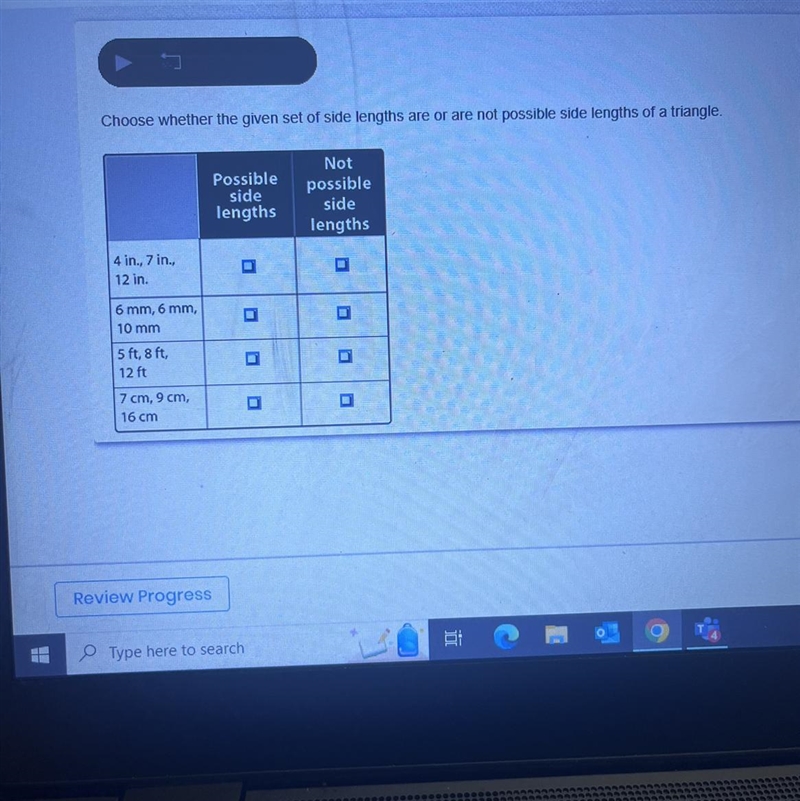 For a given set of side lengths to create a triangle, the sum of any two sides must be greater than the length of the third side.