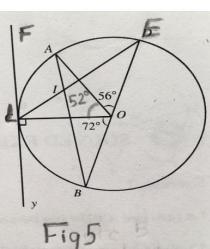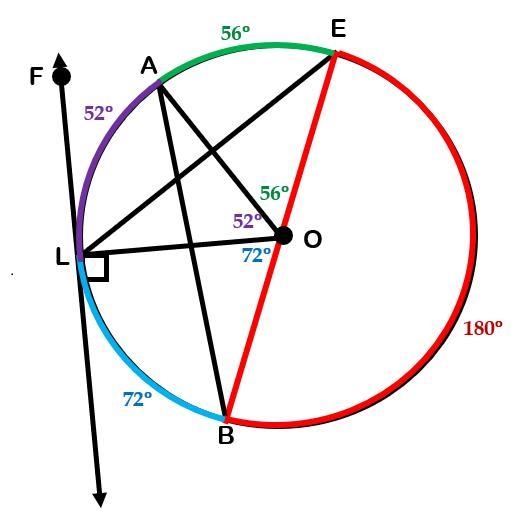 Can find measure of arc LA using 360-72-180-56=52 degrees.