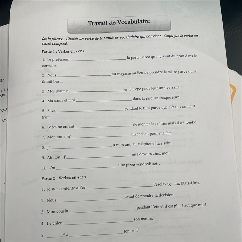 Lis la phrase. Choisis un verbe de la feuille de vocabulaire qui convient. Conjugue le verbe au passé composé.