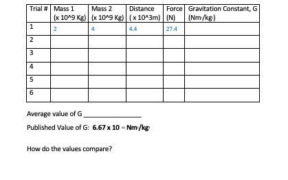 Comparing the average value of G obtained from the experiment with the published value of G, we can see that there is a significant difference between the two values. The average value of G obtained from the experiment is much larger than the published value of G. This could be due to experimental error or other factors that were not taken into account during the experiment.