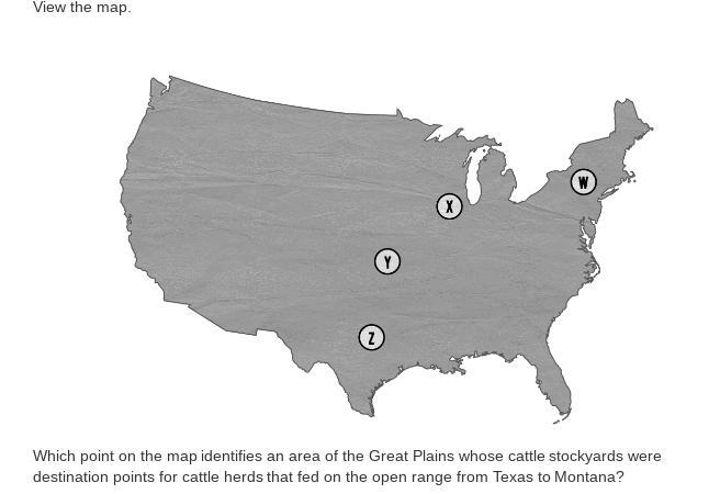 Which point on the map identifies an area of the Great Plains whose cattle stockyards were destination points for cattle herds that fed on the open range from Texas to Montana?<…