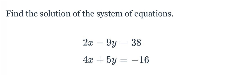 Subtract 8x + 10y = −32 from 8x − 36y = 152 by subtracting like terms on each side of the equal sign: