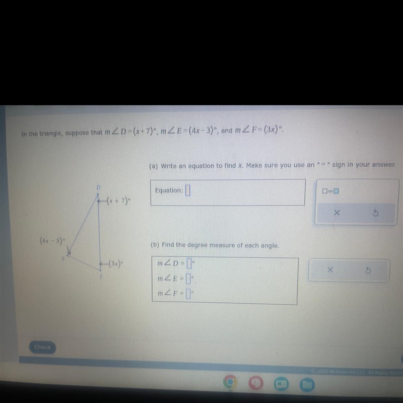 Equation: (x + 7) + (4x - 3) + (3x) = 180°
