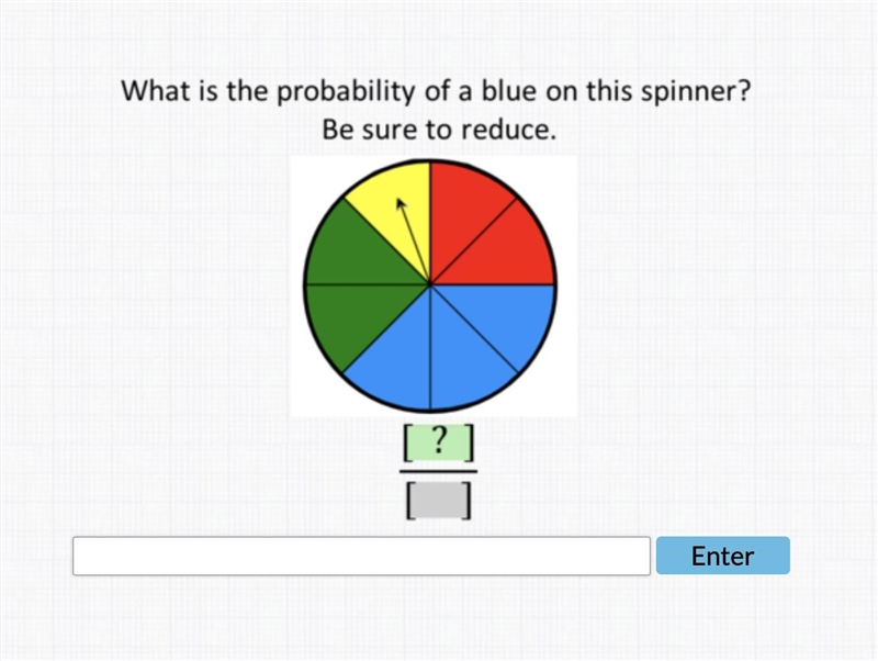 there are 8 slots and three of them are blue if you need decimal form then here: 0.375. The percentage is: 15% i think
