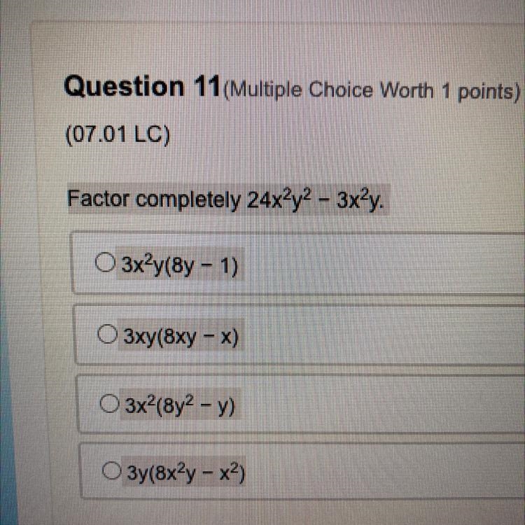 Factor completely 24x²y2 - 3x²y. О 3x2y(8у - 1) О 3ху(8ху - x) O 3x2(8y2 - y) О 3У(8х2у - х2)