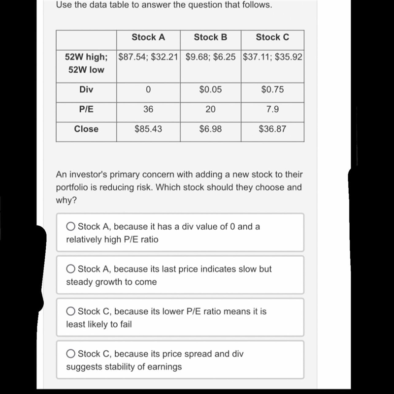 Stock C, because its relatively lower P/E ratio indicates the others may be overvalued-