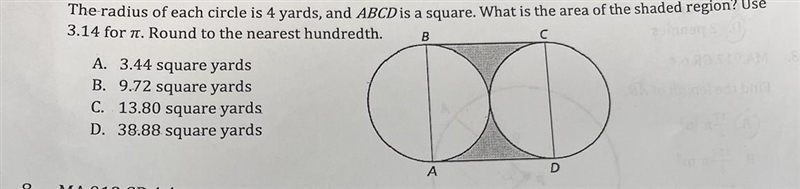 The radius of each circle is 4 yards, and ABCD is a square. What is the area of the shaded region. Use 3.14 for T. Round to the nearest hundredth.