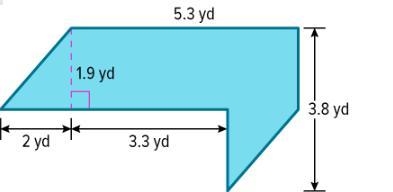 Calculate both the triangles area which equals 3.8 yards combined. Next calculate the middle rectangle's area which equals 6.27 yards squared. Add them and the answer is 19.07 yards squared.