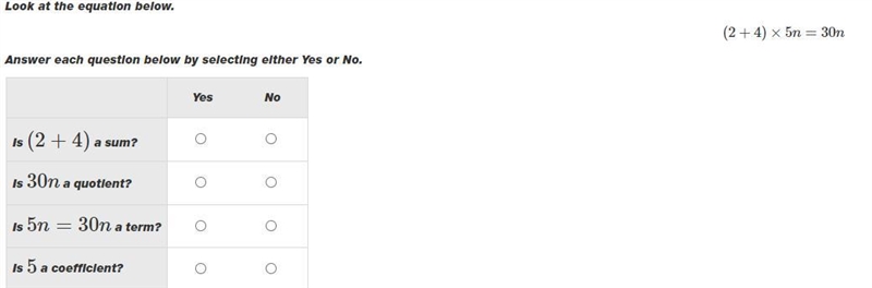Look at the equation below. (2+4)×5n=30n Answer each question below by selecting either Yes or No.