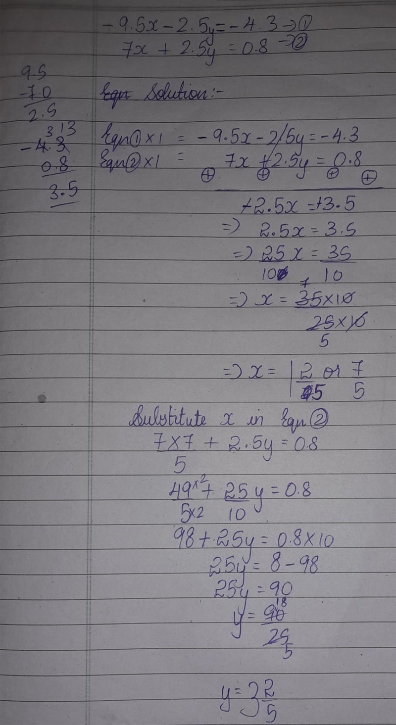 -9.5 X -2.5 Y equals -4.3 and 7X +2.5 Y equals 0.8 what is the solution to the system?