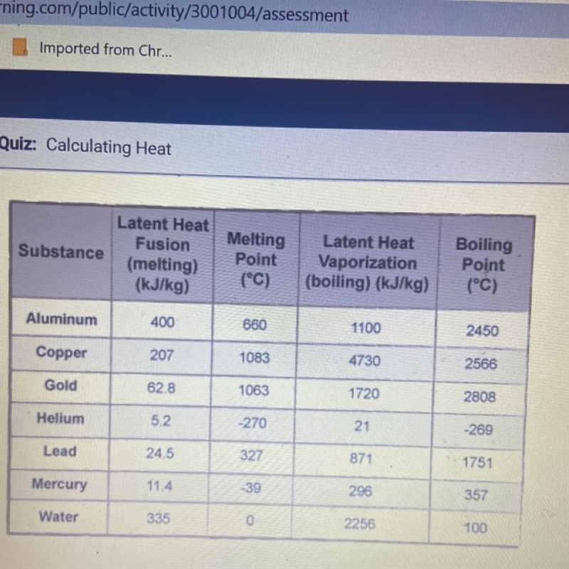 How much energy is required to vaporize 2 kg of copper? Use the table below and this equation: Q = mLvapor- A. 414 kJ B. 9460 kJ C. 4730 kJ D.207 kJ
