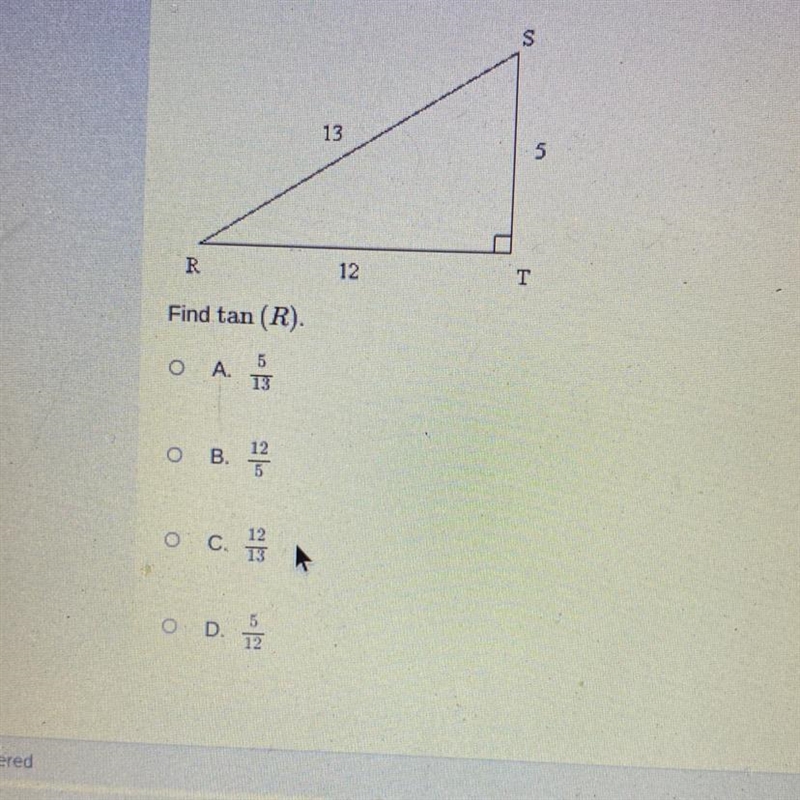 Find tan (R) A. 5/13 B. 12/5 C. 12/13 D. 5/12