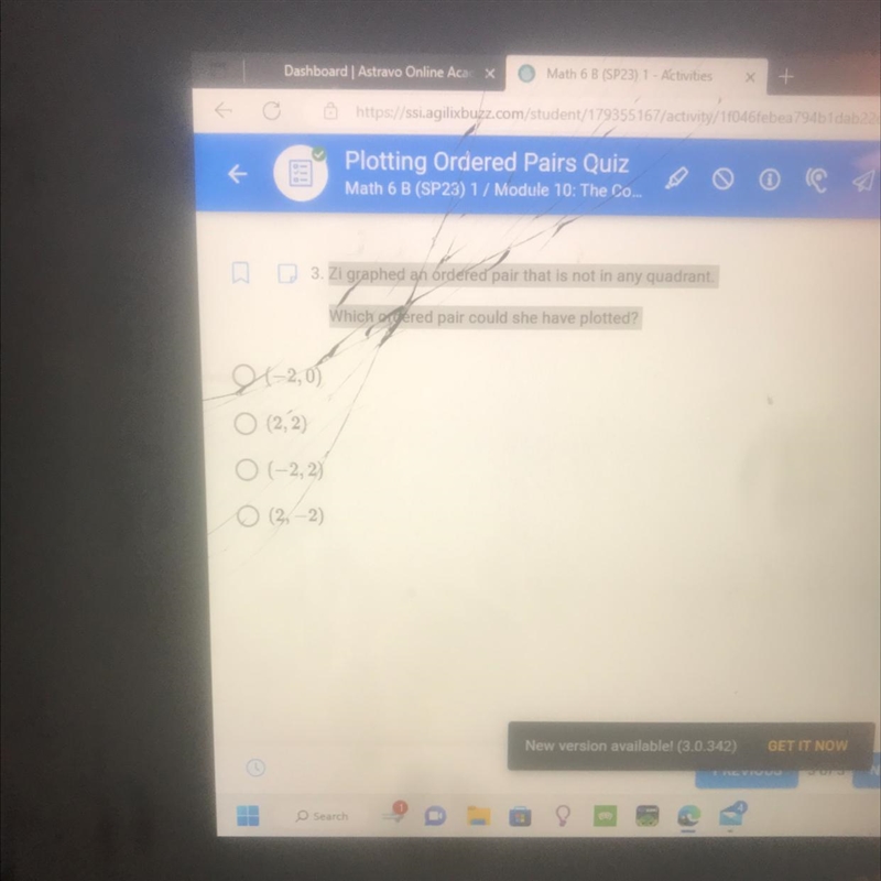 The point (-2, 0) does not lie on any quadrant as it lies right on the x-axis.