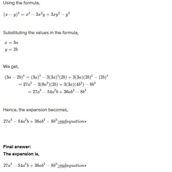 So the expression (3a - 2b)³ expanded is 27a³ - 54a²b + 36ab² - 8b³.