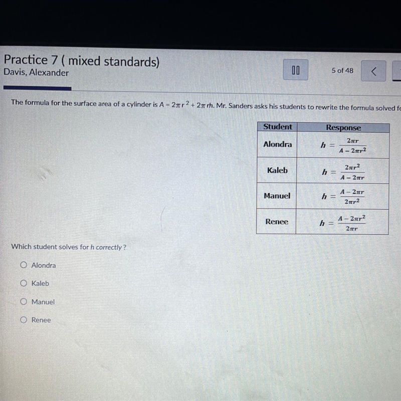 The formula for the surface area of a cylinder is A-2πr^2+2πrh. Mr. Sanders asks his students to rewrite the formula solved for h. The table shows the responses of four students.