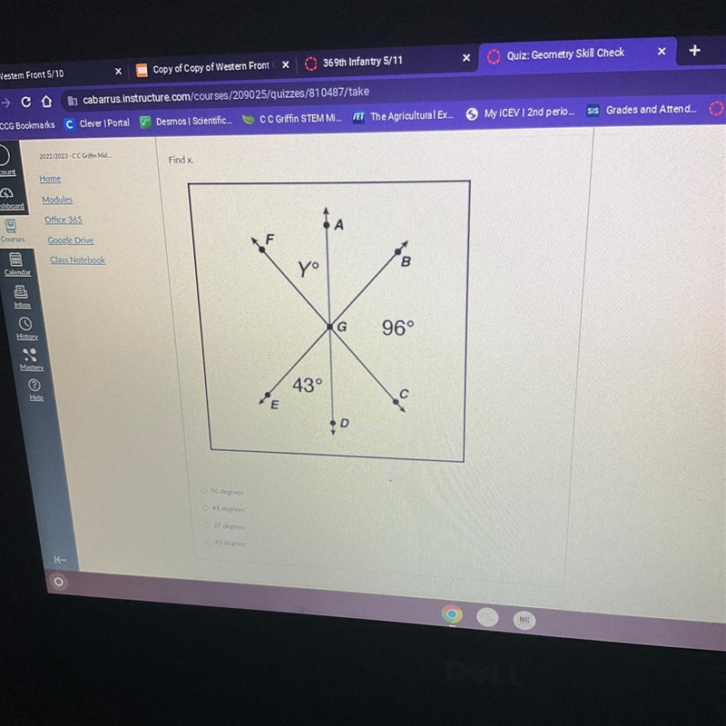 Find y A. 96 degrees B. 41 degrees C. 37 degrees D. 43 degrees