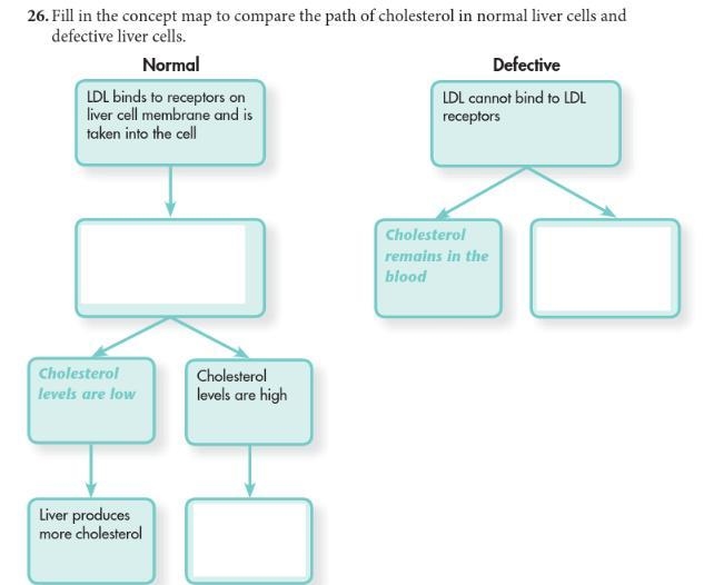 PLEASE HELP!!!!! - Fill in the concept map to compare the path of cholesterol in normal liver cells and defective liver cells.
