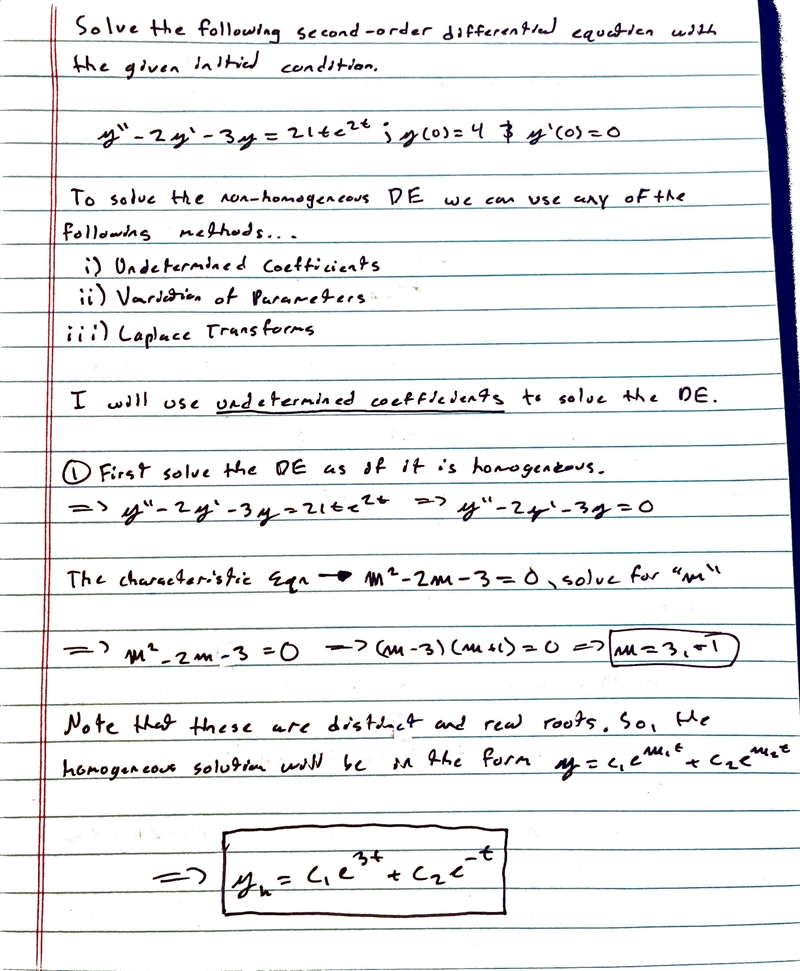 Find the solution of the initial value problem y'' - 2y' -3y = 21te^2t , y(0)=4 y'(0)=0. Please show all steps.