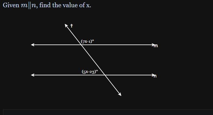 (5x - 23)° + (7x - 1)° = 180° because the these angles are supplementary angles.