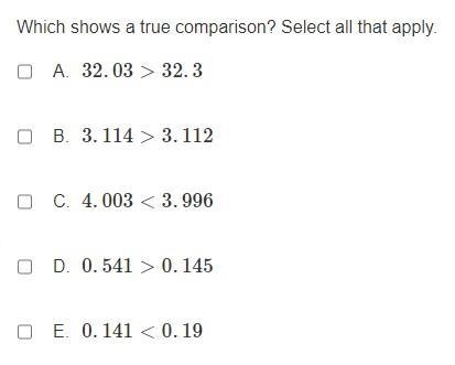 Which shows a true comparison? Select all that apply. A. 32.03 > 32.3 B. 3.114 &gt-example-1
