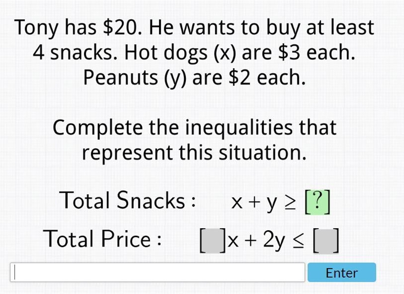 Tony has $20. He wants to buy at least 4 snacks. Hot dogs (x) are $3 each. Peanuts (y are $2 each. Complete the inequalities that represent this situation.
