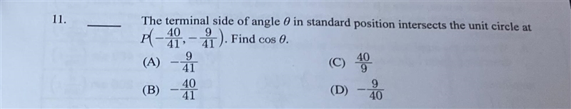 You want the cosine of θ if its terminal ray intersects the unit circle at P(-40/41, -9/41).