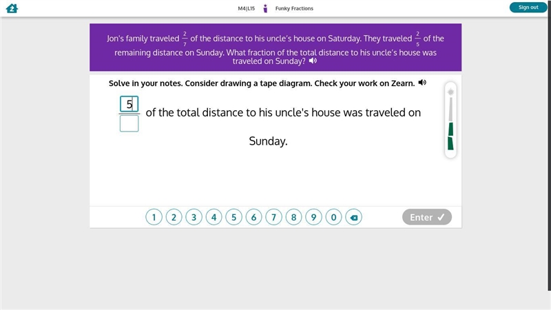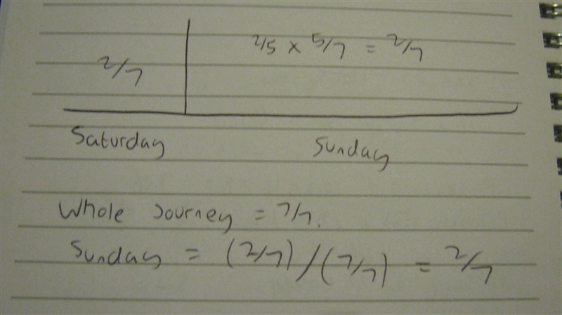 7/7 is the whole journey. so they travelled (2/7) / (7/7) = 2/7 of the total distance on sunday.
