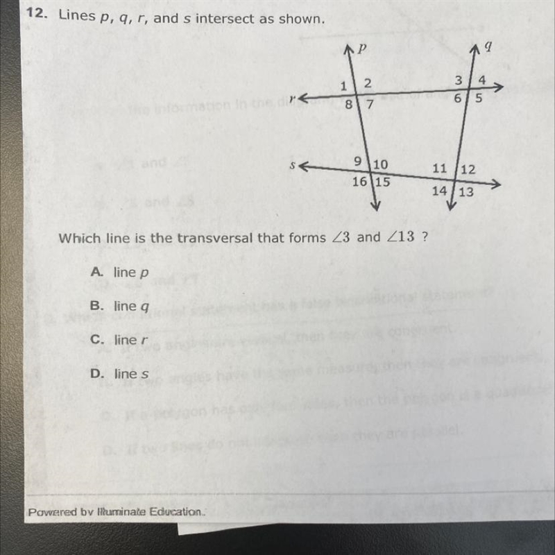 QUICKLY Parallel lines r and s are cut by two transversals, parallel lines t and u. Which angles are alternate exterior angles with angle 11? Angle5 and Angle13 Angle7 and Angle15 Angle6 and Angle16 Angle8