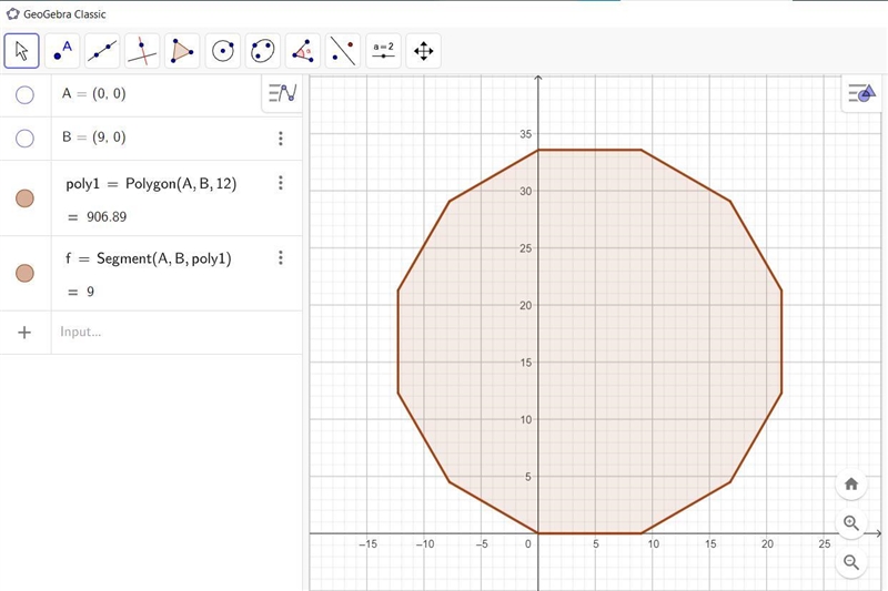 Now we have calculated the apothem, substitute this along with n = 12 and s = 9 into the area of a polygon formula